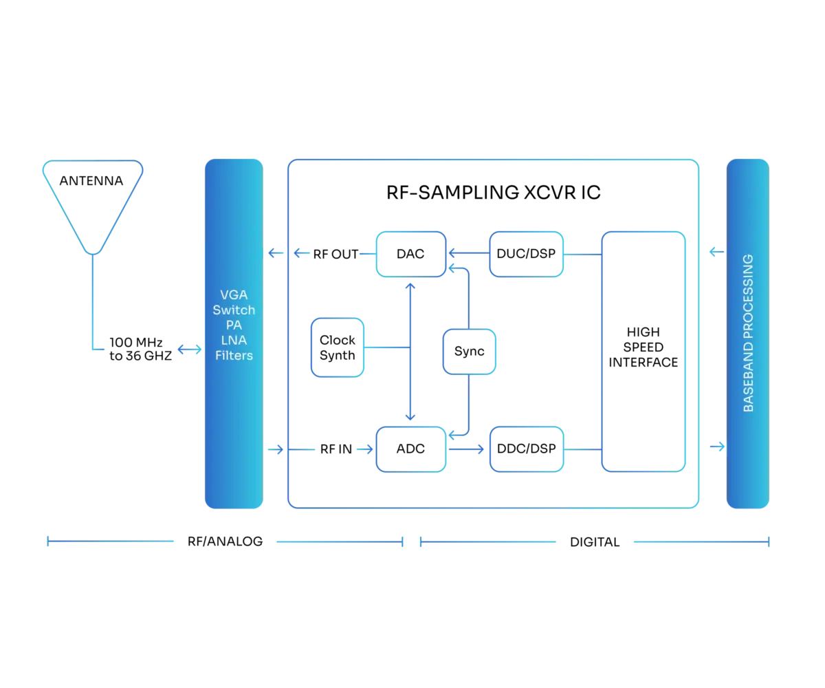 At microwave frequencies, move the sampling to the antenna frequency and replace conventional RF components with ultra-high-speed ADCs and DACs to perform frequency conversion and filtering operations in the digital domain.